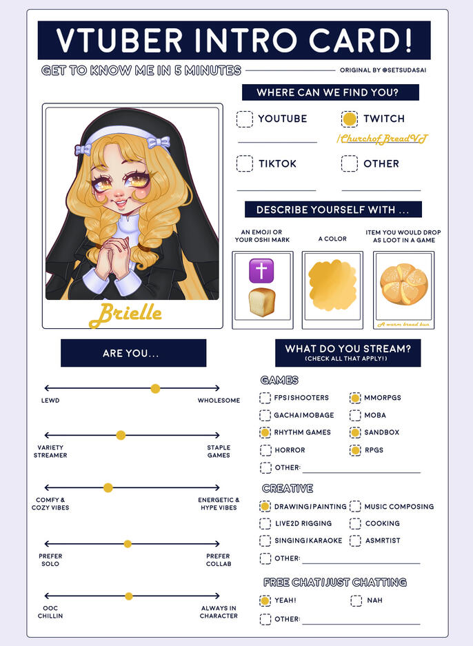 Brielle grew up in a small village known for its exceptional bread, where she was taught the importance of serving others. When she became of age, she felt drawn to a life of service and decided to join the Church of Bread as a nun. The church was led by Father Amylase, a living piece of bread who had been revered by the villagers for generations.As one of Father Amylase's most devoted followers, Brielle embraced her duties wholeheartedly. She spent her days baking loaves for those in need, comforting souls with warm meals, and spreading love and kindness wherever she went. Despite never quite understanding how Father Amylase could walk and talk like a regular human being, Brielle trusted in his wisdom and guidance. Perhaps it was her village's history of bread making that gave the holy figure body and soul.With each passing day at the Church of Bread, Brielle found herself more connected to her purpose and faith than ever before. She knew that this was where she belonged – serving others alongside Father Amylase and spreading joy through their shared belief in the power of compassion and community, and also delicious bread.
